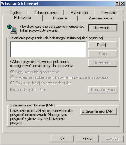 4.Z Okna Opcje Internetowe wybrać zakladkę Polaczenia i wejść na Ustawienia sieci LAN.