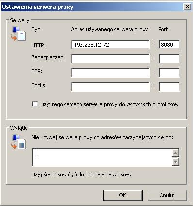 6.Wpisać adres 193.238.12.72 w polu HTTP oraz port 8080.